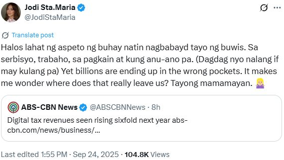 Actress Jodi Sta. Maria reacted to news that digital tax revenues could rise sixfold next year.